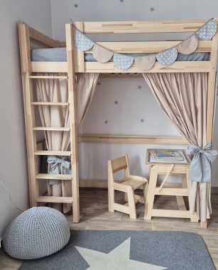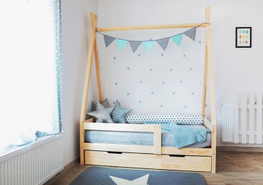 Naszą ofertę tworzą niezwykłe łóżka TIPI wraz z solidnymi ramami, wygodnym materacem, szufladami, barierką ochronną, narzutą na łóżeczko, panelami na ścianę, a także pojemną kieszenią, w której z powodzeniem można przechowywać książki, zabawki i inne akcesoria. Tak urządzony pokój otworzy dziecięcą kreatywność na nowe zabawy. Doskonale sprawdzi się także jako miejsce odpoczynku, drzemki i spokojnego snu.