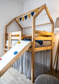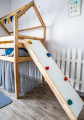 Ściankę wspinaczkową można doczepić za pomocą haków na bocznej lub przedniej części łóżek wysokich ( łóżka piętrowe, łóżka z antresolą) . Idealnie pasuje do wysokich łóżek domków Mia&Lou.